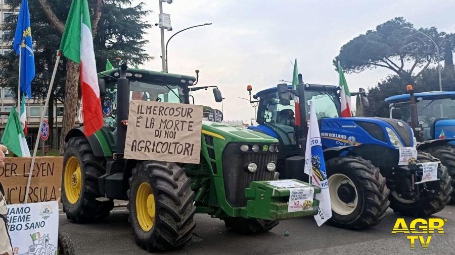 Gli agricoltori hanno esposto striscioni contro l’accordo UE-Mercosur, contro la presidente della Commissione europea Ursula von der Leyen e in difesa delle produzioni agricole italiane.