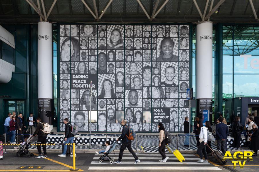 (AGR) Un grande messaggio di pace accoglierà da oggi i passeggeri in partenza dall’aeroporto di Roma Fiumicino: su una vetrata di oltre 100 mq all’ingresso del Terminal 1, è stata inaugurata l’opera collettiva “DARING PEACE TOGETHER, FOR A FUTURE WITHOUT HATE”, un’installazione in cui 108 ritratti fotografici in bianco e nero danno volto e voce a persone appartenenti a popoli, etnie e religioni diverse, confermando il ruolo dello scalo come spazio di incontro e dialogo.