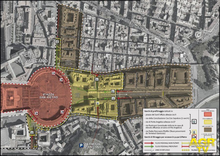 L’area urbana periferica sarà suddivisa in due ulteriori zone di servizio, di cui la prima – area riservata – sarà cinturata da varchi di filtraggio presso i quali opereranno in un primo controllo agenti e contingenti della Forza pubblica lungo le tre direttrici di Porta Angelica, piazza del Sant’Uffizio e via della Conciliazione, in quest’ultimo caso con due canali di accesso, con le check station rispettivamente in Piazza del Sant’Uffizio altezza civico 11, Via della Conciliazione altezza civici 24 e 15 e Via di Porta Angelica altezza civico 57.