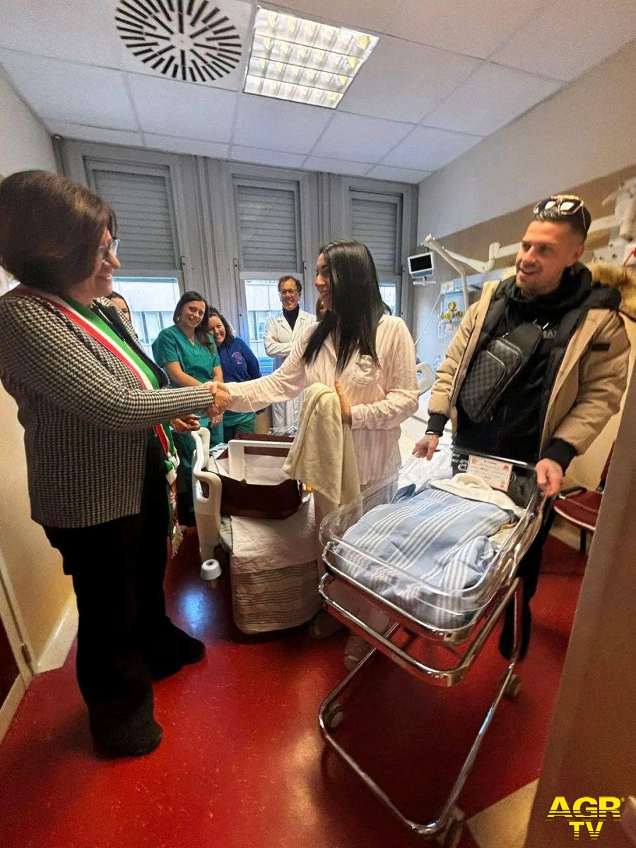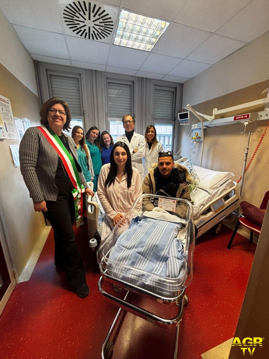 L'assessore alle Politiche Sociali ed alla Salute Barbara Funari, con la fascia tricolore, ha portato i saluti della città di Roma e, come da tradizione, in regalo una copertina e dei fiori alla mamma Sabrina e papà Kevin. E' nata al S. Eugenio una mezz'ora dopo la mezzanotte, pesa 3 kg e 230 gr.