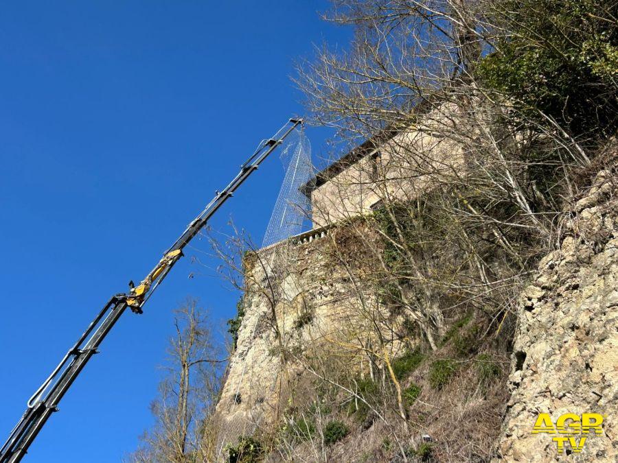 L'intervento prevede l’ancoraggio con reti chiodate ad alta resistenza della porzione di costone e del muro lesionato, per una superficie complessiva di circa 200 metri quadrati. Segnalini: operazioni necessarie e tempestive, eseguite con tutte le cautele richieste per garantire la sicurezza