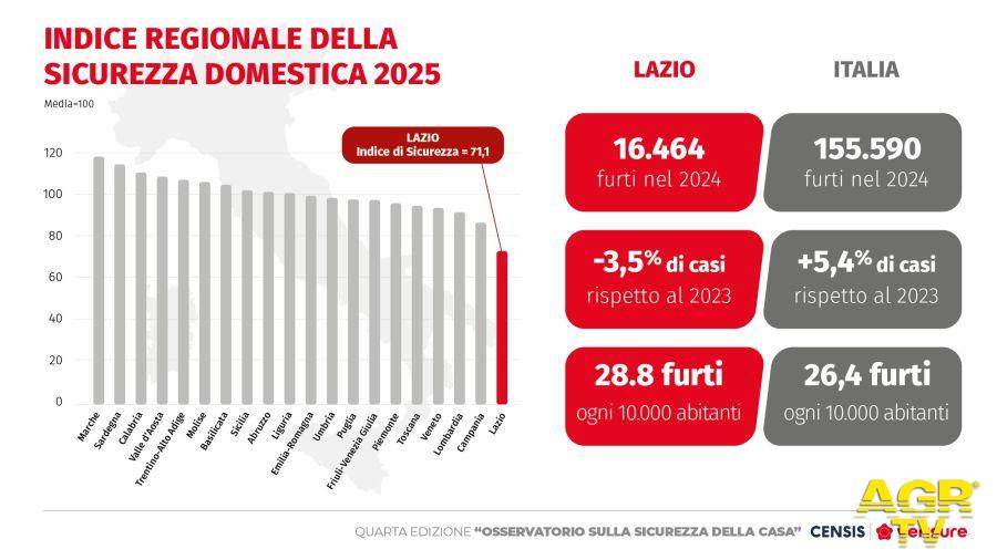Nel 2025, l’indice Censis-Verisure ha misurato il grado di sicurezza, reale e percepita, delle diverse regioni italiane rispetto agli eventi pericolosi che possono accadere all’interno delle mura domestiche e il Lazio si è posizionato al 20° posto, confermandosi per il terzo anno consecutivo all’ultima posizione della classifica nazionale.