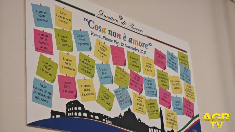 Durante la cerimonia di inaugurazione di “Una stanza tutta per sé”, infatti, il Questore di Roma, con la presidente di Soroptimist international, ha apposto all’interno degli ambienti “protetti” un pannello in cui vengono riprodotti i “post it” manoscritti da chi, il 22 novembre del 2025, in piazza Pia, ha condiviso l’iniziativa promossa dalla Questura capitolina sul tema “Cosa non è amore”, nell’ambito della campagna dedicata alla prevenzione ed al contrasto della violenza di genere.