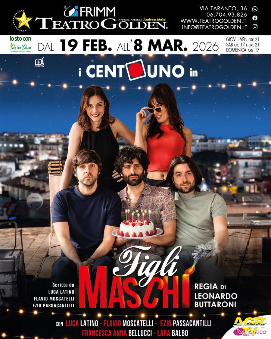 (AGR) Chi almeno una volta nella vita non ha mai pronunciato l'adagio un po' desueto: “Auguri e figli maschi”? Al Teatro Golden, dal 19 febbraio all'8 marzo, i bravissimi Centouno (Luca Latino, Flavio Moscatelli, Ezio Passacantilli) con Francesca Anna Bellucci e Lara Balbo, portano in scena lo spettacolo "Figli Maschi" .
