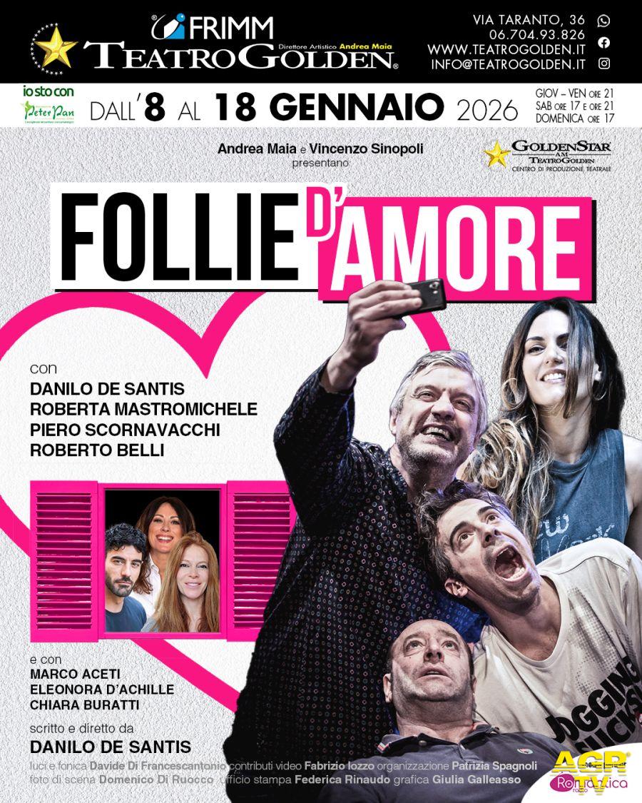 (AGR) Cosa desiderare per il nuovo anno? Sicuramente la cosa più preziosa di tutte è l'amore, che poi è davvero il motore della vita. E per questo al Teatro Golden riparte il cartellone con le novità del 2026 e la prima ad andare in scena è la commedia "Follie d'amore" , con Danilo De Santis, Roberta Mastromichele, Piero Scornavacchi, Roberto Belli e con Marco Aceti, Chiara Buratti, Eleonora D'Achille, scritta dallo stesso De Santis.
