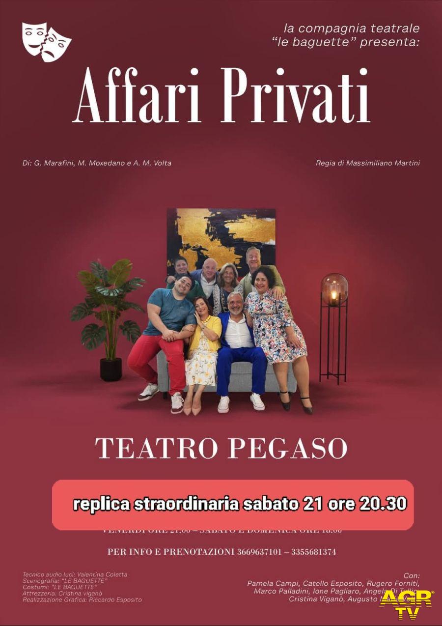 (AGR) Dopo una breve pausa riprendono le rappresentazioni al Teatro Pegaso e, in contemporanea, ecco la seconda parte del cartellone.Com’è noto, il direttore artistico Antonia Di Francesco per la stagione 2025/2026 ha scelto questa formula per “curare meglio l’aspetto organizzativo”.Per il prossimo week end la Sala Massimo Troisi propone “Affari privati” di Giuseppe Marafini e Maurizio Moxedano, con la regia di Massimiliano Martini.