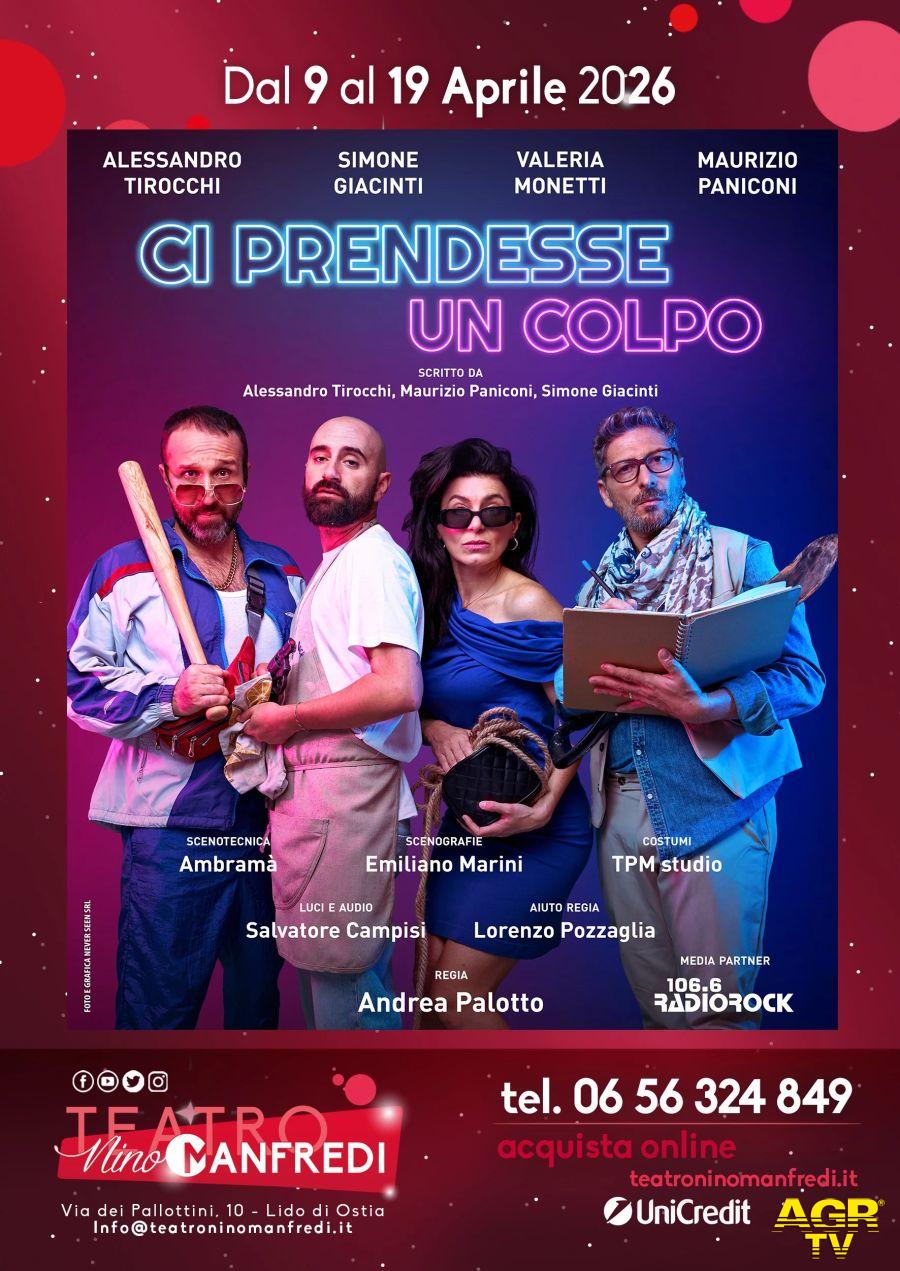 (AGR) Dal 9 al 19 aprile al teatro Manfredi di Ostia in via dei Pallottini arriva la commedia brillante: "Ci prendesse un colpo" una piece teatrale italiana di successo scritta e interpretata da Alessandro Tirocchi , Maurizio Paniconi e Simone Giacinti.Lo spettacolo segue la storia personale di quattro protagonisti insoddisfatti che, accomunati da fallimenti personali e mancanza di denaro, decidono di compiere un improbabile furto d'arte come rivalsa.La storia esplora il desiderio di riscatto dei quattro personaggi - Stella (delusa dalla moda), Walter (architetto licenziato), Gianni (ex promessa del calcio) e Bogdan (economista rom ingiustamente allontanato) - che si uniscono per cambiare la propria vita.