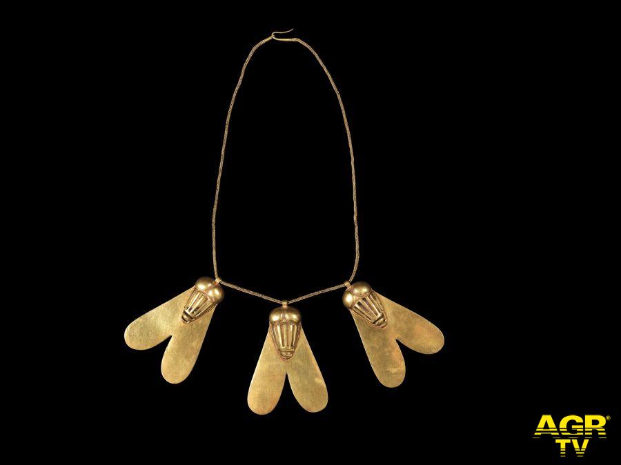 Tesori dei Faraoni è un viaggio nella civiltà egizia attraverso le sue forme più alte e insieme più intime: potere, fede, vita quotidiana. Il percorso apre con lo splendore dell’oro, materia divina e simbolo dell’eternità. Il sarcofago dorato della regina Ahhotep II, la Collana delle Mosche d’oro, antica onorificenza militare per il valore in battaglia, e il collare di Psusennes I introducono al mondo delle élite egizie, dove l’ornamento diventa linguaggio politico e riflesso di una teologia del potere. Intorno al corredo funerario di Psusennes I, scoperto a Tanis nel 1940, si concentrano oggetti di straordinaria raffinatezza: amuleti, coppe e gioielli che, dopo tremila anni, conservano intatta la loro luce.