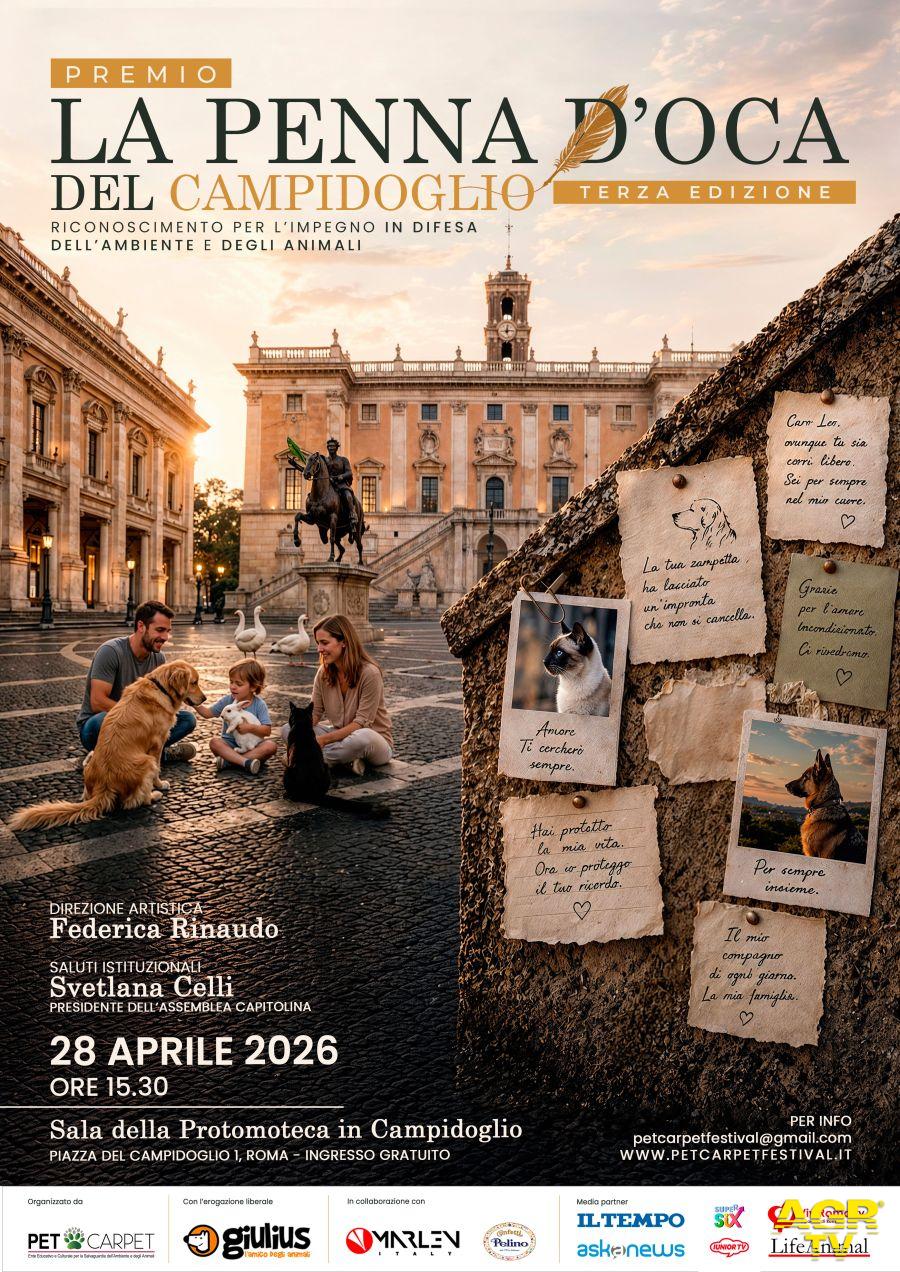 Dalla leggenda delle oche di Roma che salvarono la città... alla forza del gatto Rosi e del cane Ombra: al via la "Penna d’Oca del Campidoglio", il premio che sfida l'AI con il valore dell'umanità. Appuntamento 28 aprile nella Sala della Protomoteca in Campidoglio ore 15.30