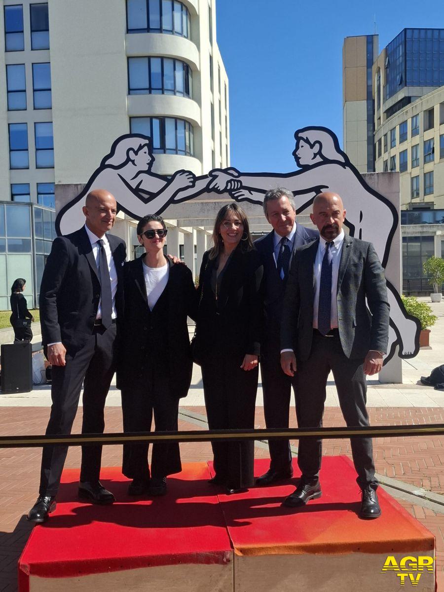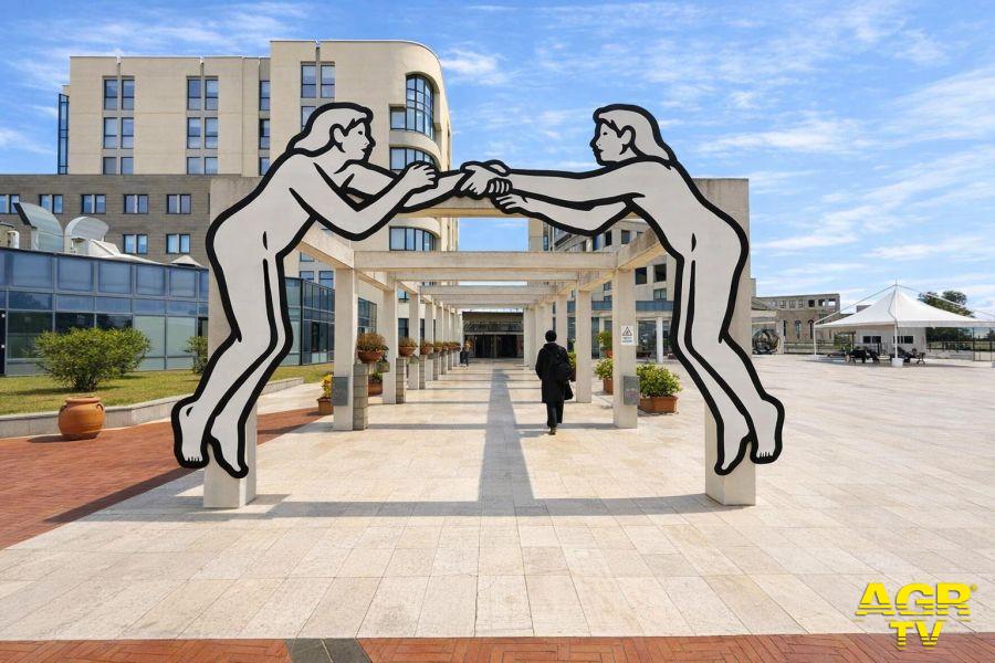 Nella settimana della salute della donna, da sempre figura centrale nei percorsi di cura, è stata svelata l’opera dell’artista MP5, “Uno Uno”, che rappresenta l’incontro tra persone, vicinanza e protezione reciproca, un invito a riflettere sul valore della relazione come fondamento della cura. È posta all’inizio del colonnato dell’ingresso principale perché quando una persona entra in ospedale, porta con sé preoccupazioni, paure, aspettative. Se quello spazio attraverso il linguaggio dell’arte trasmette accoglienza, relazione, prossimità, allora cambia la percezione stessa della cura che diventa un’esperienza più ampia. La fragilità del singolo diventa forza collettiva, l’opera richiama all’attenzione, alla cura reciproca, alla solidarietà e al dialogo.