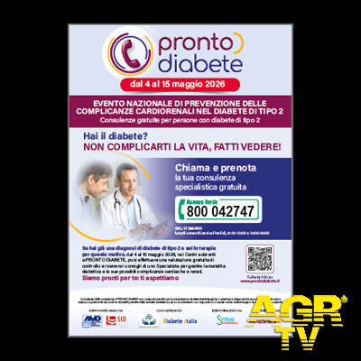 (AGR) Torna Pronto Diabete 2026, la campagna nazionale che dal 4 al 15 maggio mette a disposizione ai pazienti con Diabete Mellito di Tipo 2 consulenze diabetologiche gratuite in 50 centri specialistici distribuiti su tutto il territorio nazionale. Le prenotazioni sono attive da oggi al Numero Verde 800 042747 sul sito www.prontodiabete.it.